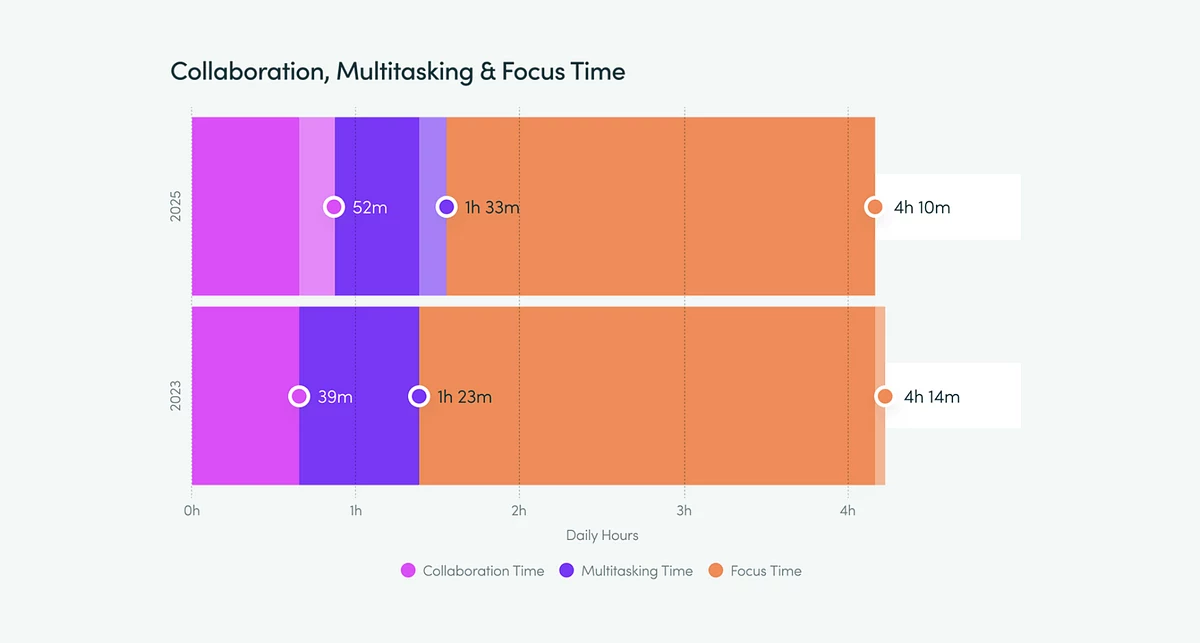 Изменение структуры рабочего времени: к 2025 году сотрудники стали больше времени тратить на взаимодействие и многозадачность (52 минуты и 1 час 33 минуты в день соответственно), тогда как время глубокой концентрации немного сократилось — с 4 часов 14 минут до 4 часов 10 минут. Это отражает рост фрагментации рабочего процесса. Источник: ActivTrak.