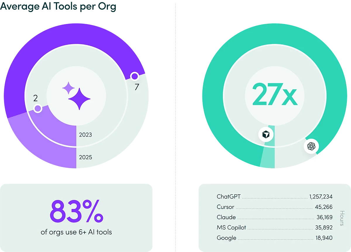 Рост использования ИИ-инструментов в компаниях: за два года среднее число платформ увеличилось с 2 до 7, а уже 83% организаций применяют шесть и более решений. При этом ChatGPT остается крупнейшим по объему использования: его применяют в 27 раз чаще, чем следующий по популярности инструмент. Источник: ActivTrak.