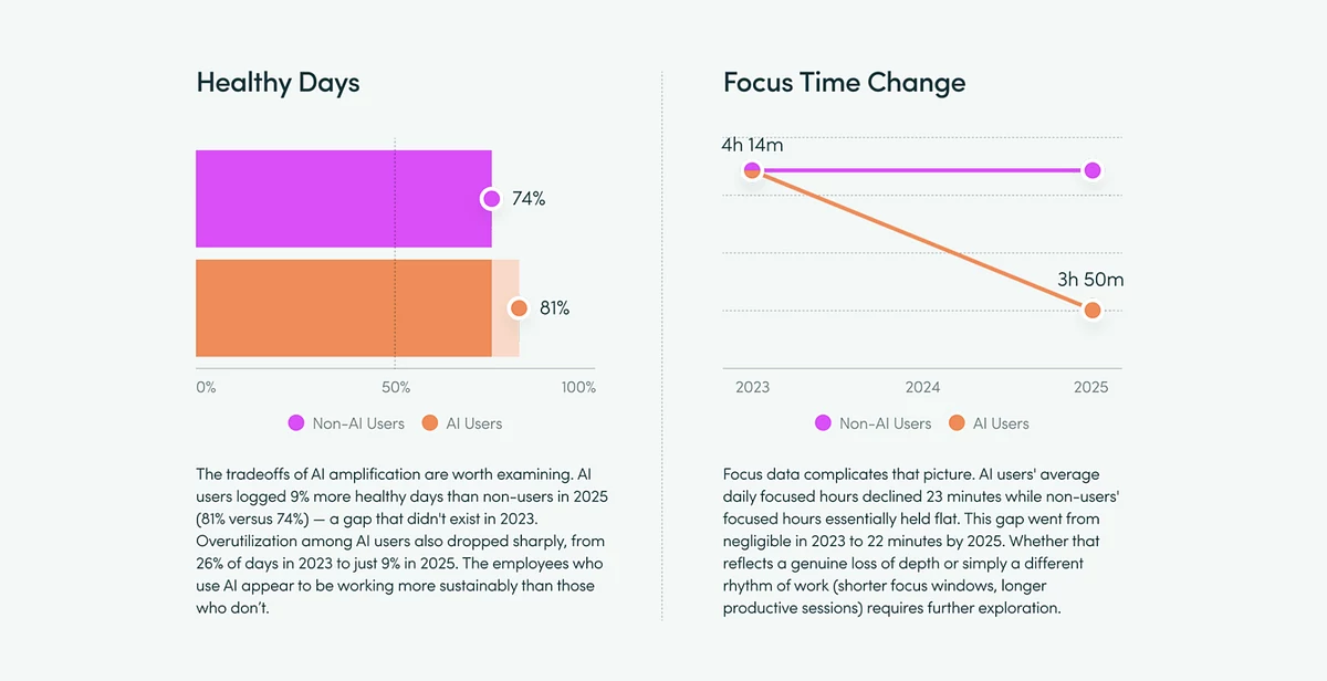 Разница в рабочих паттернах между пользователями ИИ и теми, кто его не применяет: у сотрудников с ИИ больше «здоровых» рабочих дней (81% против 74%), однако их время глубокой концентрации сокращается — в среднем до 3 ч 50 мин в день к 2025 году, тогда как у не-пользователей оно остается почти без изменений. Источник: ActivTrak.