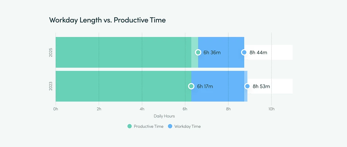 Изменение структуры рабочего дня: несмотря на сокращение общей продолжительности работы с 8 ч 53 мин в 2023 году до 8 ч 44 мин в 2025-м, продуктивное время сотрудников выросло — с 6 ч 17 мин до 6 ч 36 мин в день, что указывает на более плотный и интенсивный формат занятости. Источник: ActivTrak.