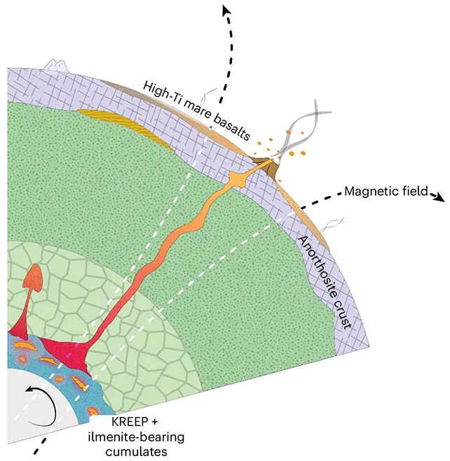 Согласно этим моделям, плавление титансодержащего материала вблизи границы между ядром и мантией Луны могло на короткое время усиливать тепловой поток из ядра, запуская или усиливая работу динамо и резко повышая магнитное поле — одновременно порождая потоки титансодержащей лавы на поверхности.