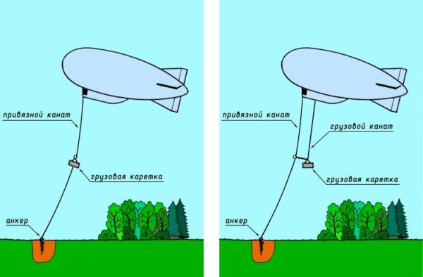 Схемы приема-сдачи груза дирижаблем в привязном режиме. В первом случае груз спускается по привязному канату, во втором ― по отдельному грузовому канату