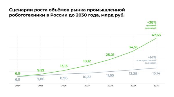 Целевой сценарий предполагает значительно более быстрый рост. При его реализации рынок промышленной робототехники в России к 2030 году может вырасти до 47,63 млрд рублей. Прогноз учитывает увеличение парка промышленных роботов до 104 тыс. единиц, а также достижение плотности роботизации на уровне 145 роботов на 10 тыс. работников. В расчётах эксперты также заложили рост производительности труда за счёт накопленного эффекта от внедрения роботов.