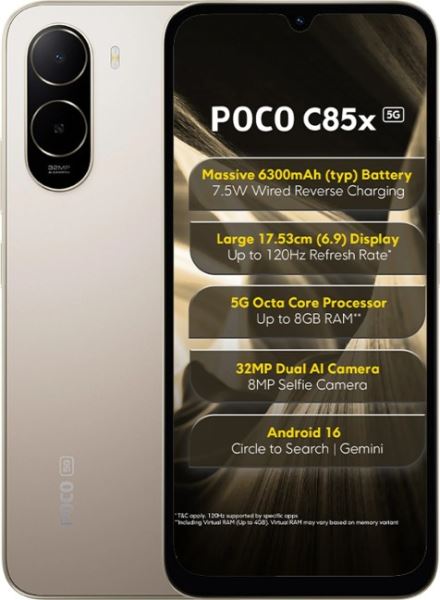 Стоить на старте продаж Xiaomi Poco C85x 5G будет ₹10999 (₽9500, $120) и ₹11999 (₽10400, $131) за версии 4+64 и 4+128 ГБ соответственно.