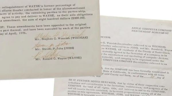 На документе стоят подписи Стива Джобса (с долей 45%), Стива Возняка (45%) и Рона Уэйна (10%). Спустя несколько дней Уэйн отказался от участия и продал свою часть за 800 долларов — договор об уходе предпринимателя тоже выставят на торги.